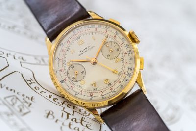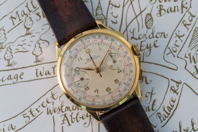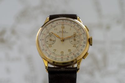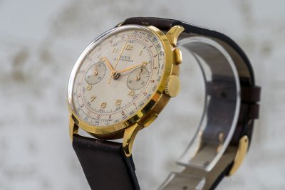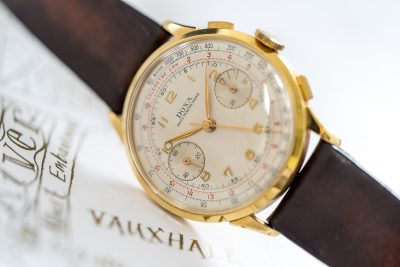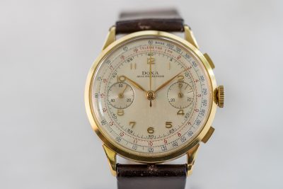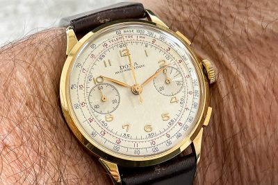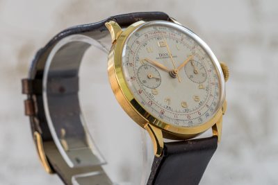 Look at this beautiful Doxa Valjoux 22 “Jumbo”, 18k Gold Chronograph from the late ’40s, early ’50s; it is as close as you can get to be in “as new” condition. Obviously, it is not, it’s over 70 years old, but wow! What a truly stunning and remarkable watch.
