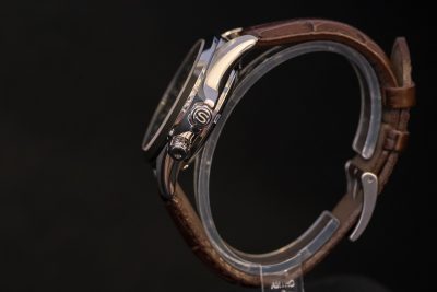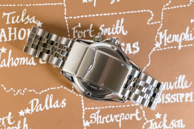 The case has a fine brushed and polished stainless steel finish and the green dial sports highly luminous gold-tone hands and hour markers. A date display is shown at the 3 o’clock position. A scratch-resistant sapphire crystal is used and the watch is water-resistant to 200 meters. The crown at 4:00 turns the inner (compass marked) bezel. On the Alpinist, the case back is solid and engraved with its unique logo and model information.